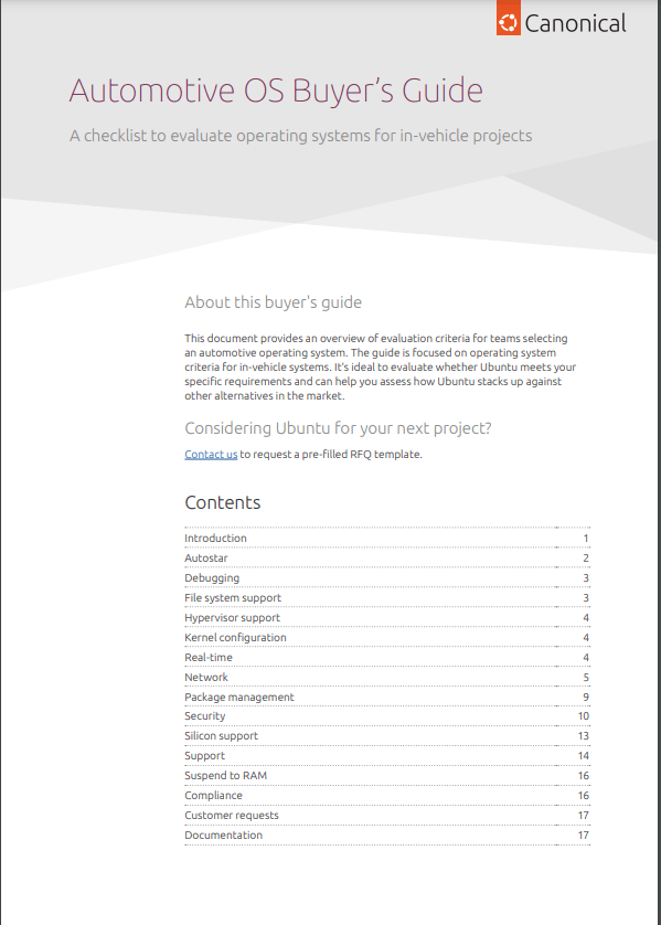 Based on our extensive experience in embedded systems, we put together an overview of considerations that will help you select the right OS for your in-vehicle projects. Our buyer's guide will also help you evaluate if Ubuntu is a good fit for you. Download the guide.